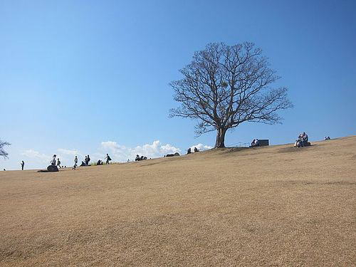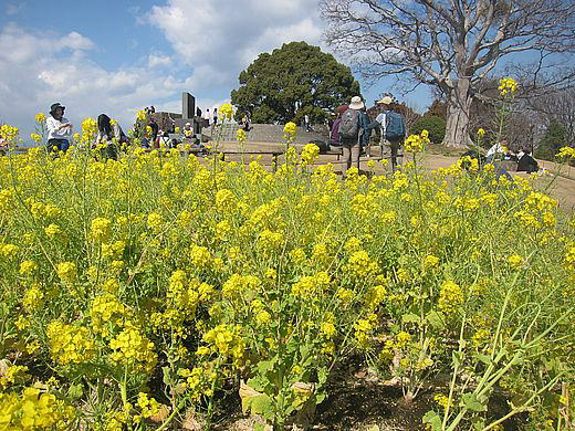 ★菜の花はどうかなと心配したが、決してそんなことはなかった。雲間から時々現れる冠雪の富士山とともに、「これぞ春」という眺めを堪能できた。とりわけ素晴らしかったのは広々とした山頂広場のおもむき。すでに葉を落とした大きな大きな榎(えのき)が、まるで影絵のようにも見える枝を四方八方に張って存在感抜群、実に開放感ある景色を作り出していた。