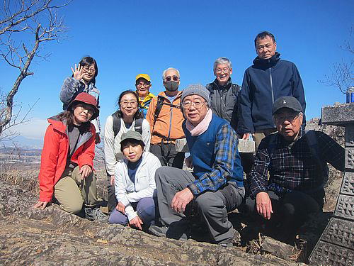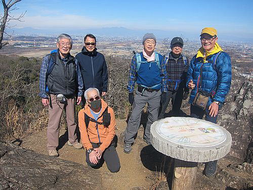 弁慶穴を覗き見た後、奥宮(小さな祠)のある岩山展望に登る。ここからの展望は素晴らしく、山座同定盤を見ながら赤城山、榛名山、子持山、小野子三山、男体山など(何れも浪漫会で登頂済)が確認できた。数メートルの高さのある岩上からの景色を堪能したメンバーもいたようだ。