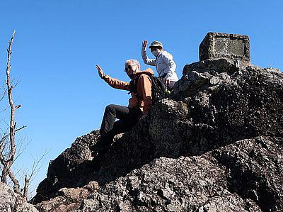 広場に一旦戻り、御嶽山頂を目指して登る。途中、ロープが設置されている滑りやすい急斜面があったが、全員頂上に立った。展望はほとんどなかったが、頂上に立ったという満足感を得て良しとしよう。尚、「御嶽城本郭跡」と云う標識があり、その昔城があったことが読み取れる。